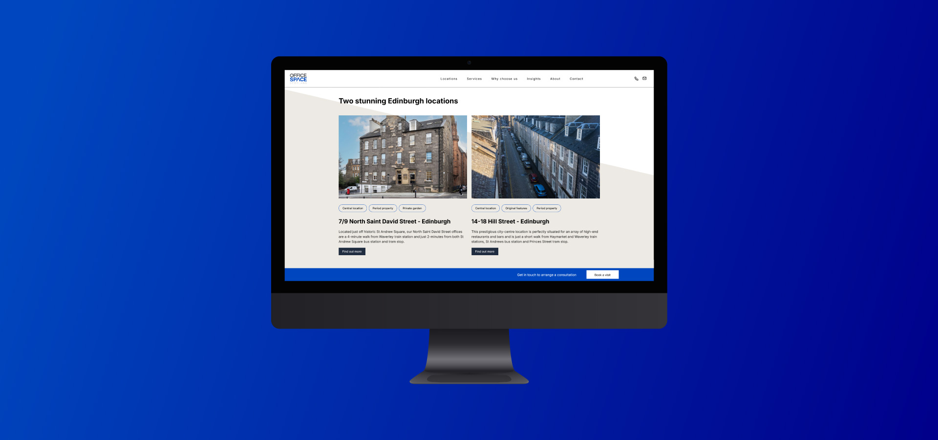 Office Space Scotland is a purpose-built serviced office website designed to compete in a highly competitive local workspace market. By combining a custom WordPress build, structured location pages, geo-targeted SEO and premium visual media, the platform delivers both strong visibility and a compelling presentation of serviced offices in the heart of Edinburgh.