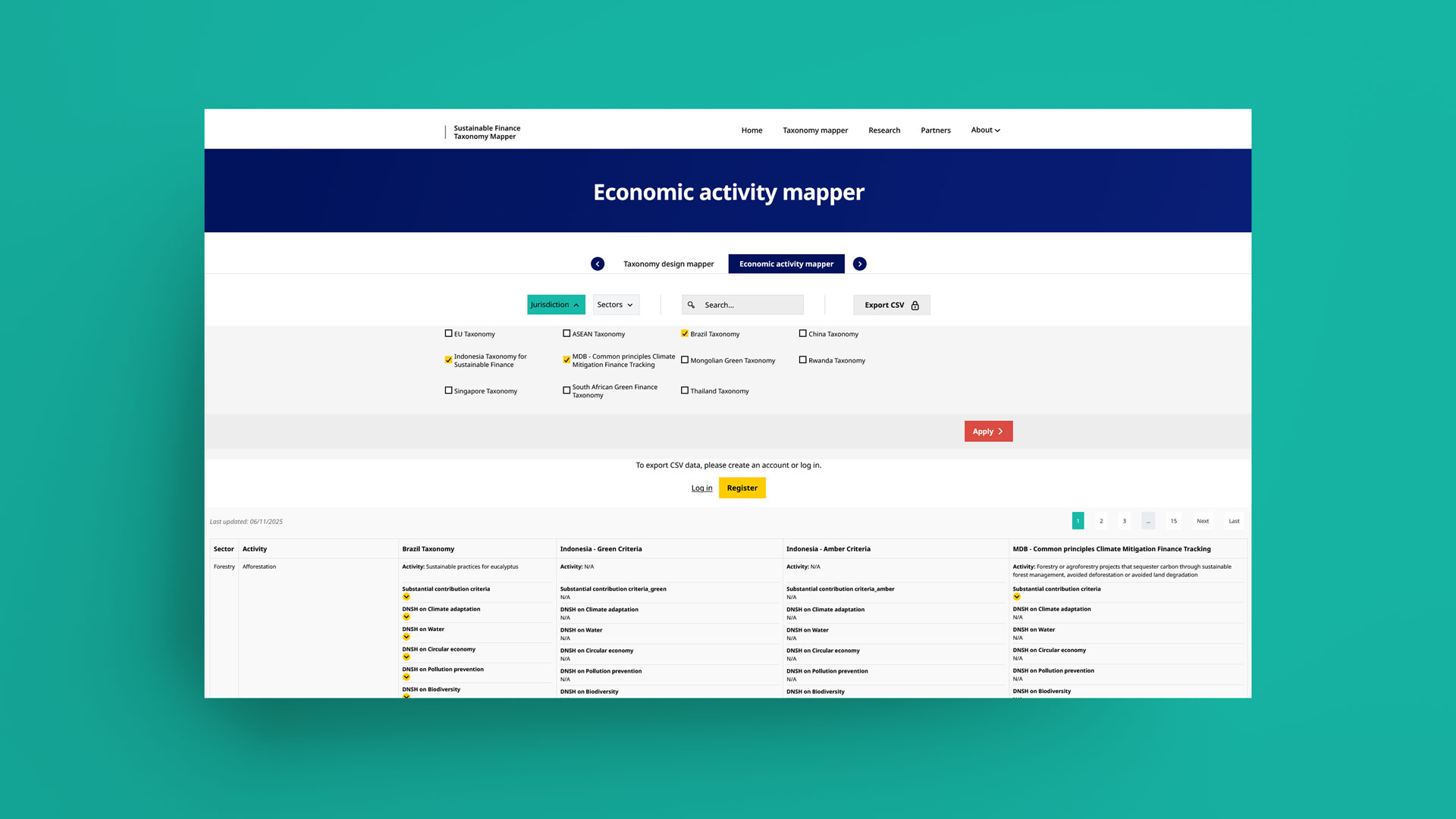 The interface was designed to present complex regulatory and policy information in a clear, readable and searchable format. Filtering and comparison tools were developed to help users quickly assess countries aligned with green investment criteria.